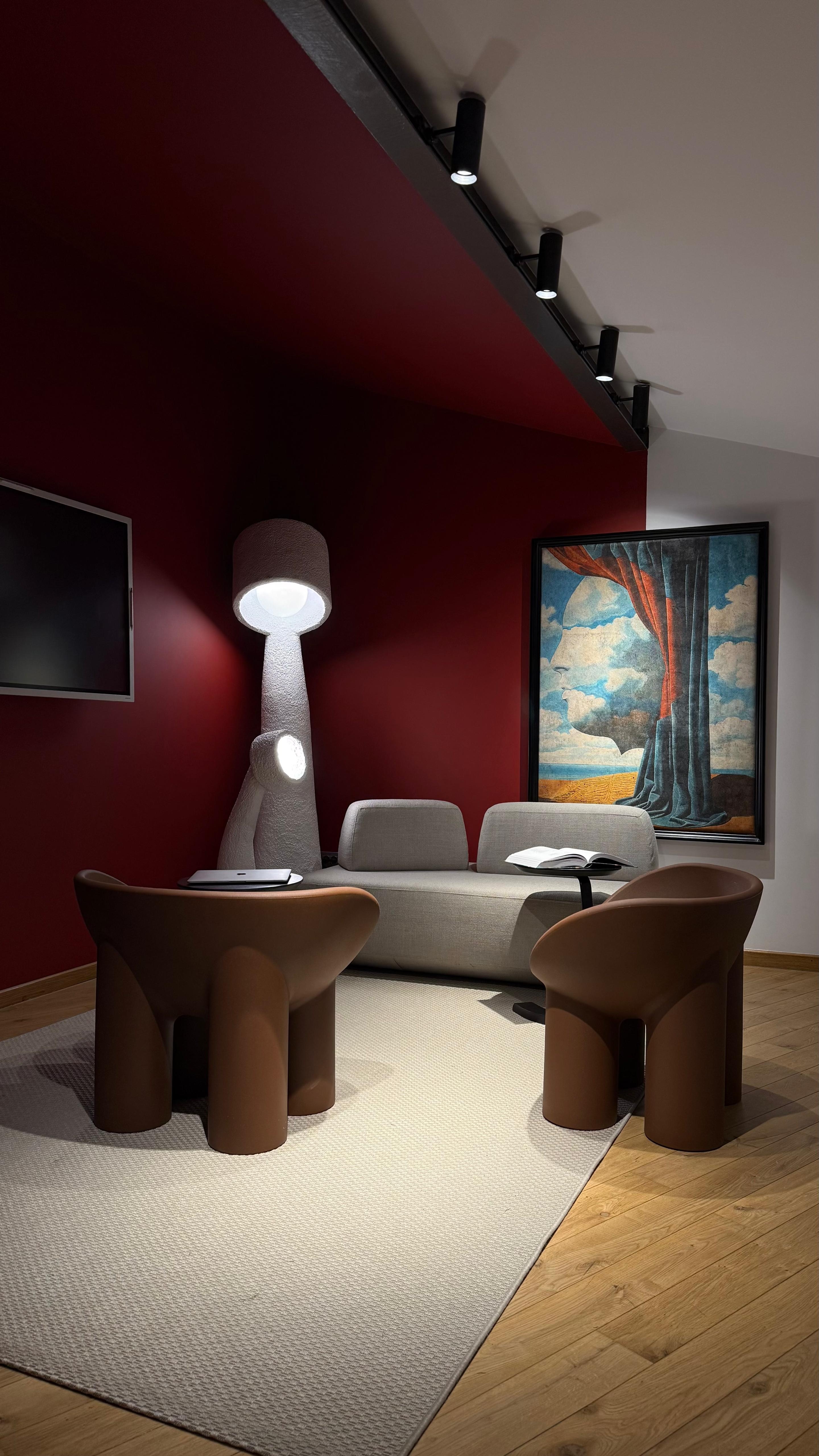Încă de la intrare, culorile intense și elementele out of the ordinary captează privirea și transmit clar identitatea spațiului. Roșul profund, accentele dramatice și compozițiile ample creează un decor memorabil, potrivit unui birou care respiră influenceri, content și expunere publică.
