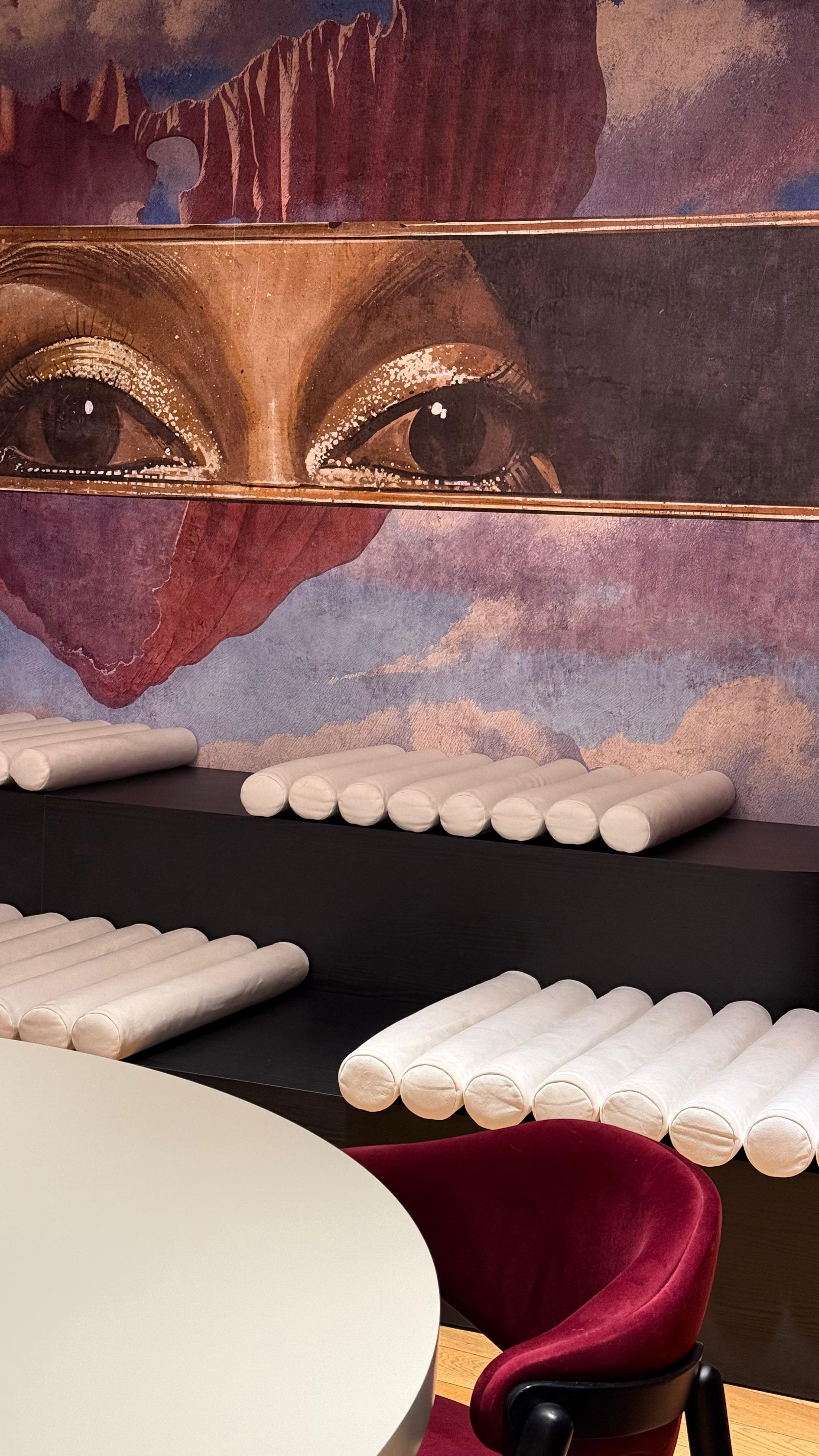 Tapetul amplasat în zona principală, cu priviri atent conturate, simbolizează the followers, publicul care urmărește fiecare mișcare a celor aflați pe scenă. Este o metaforă vizuală despre vizibilitate, presiune și puterea imaginii în era digitală. În mansardă, tapetul cu draperii deschise către cer aduce o altă dimensiune conceptuală: cortina de teatru devine simbolul scenei, iar cerul reprezintă creativitatea fără limite. Sky is the limit atunci când ești în lumina reflectoarelor.