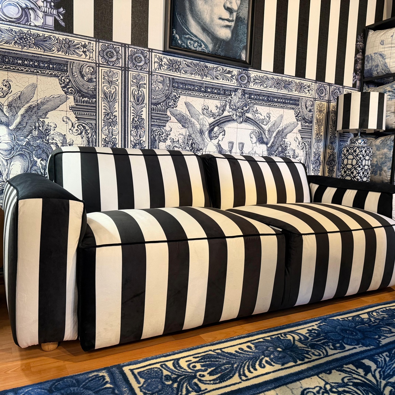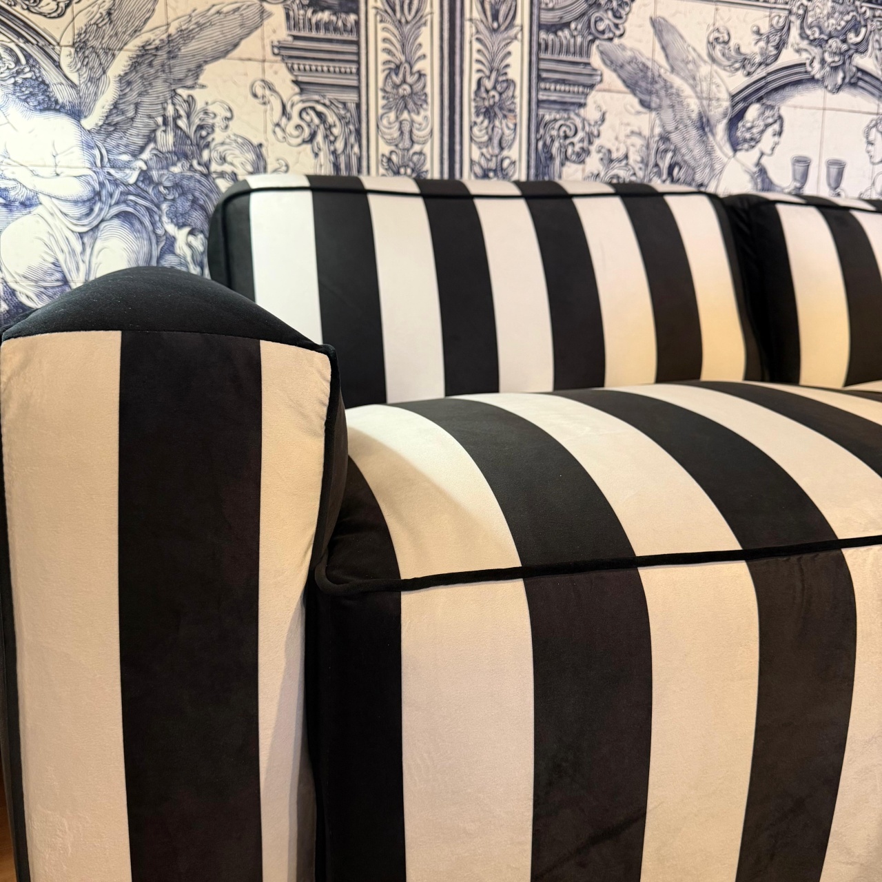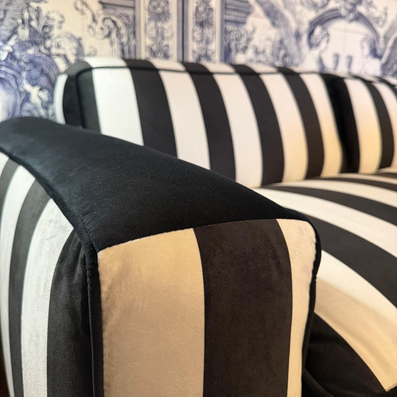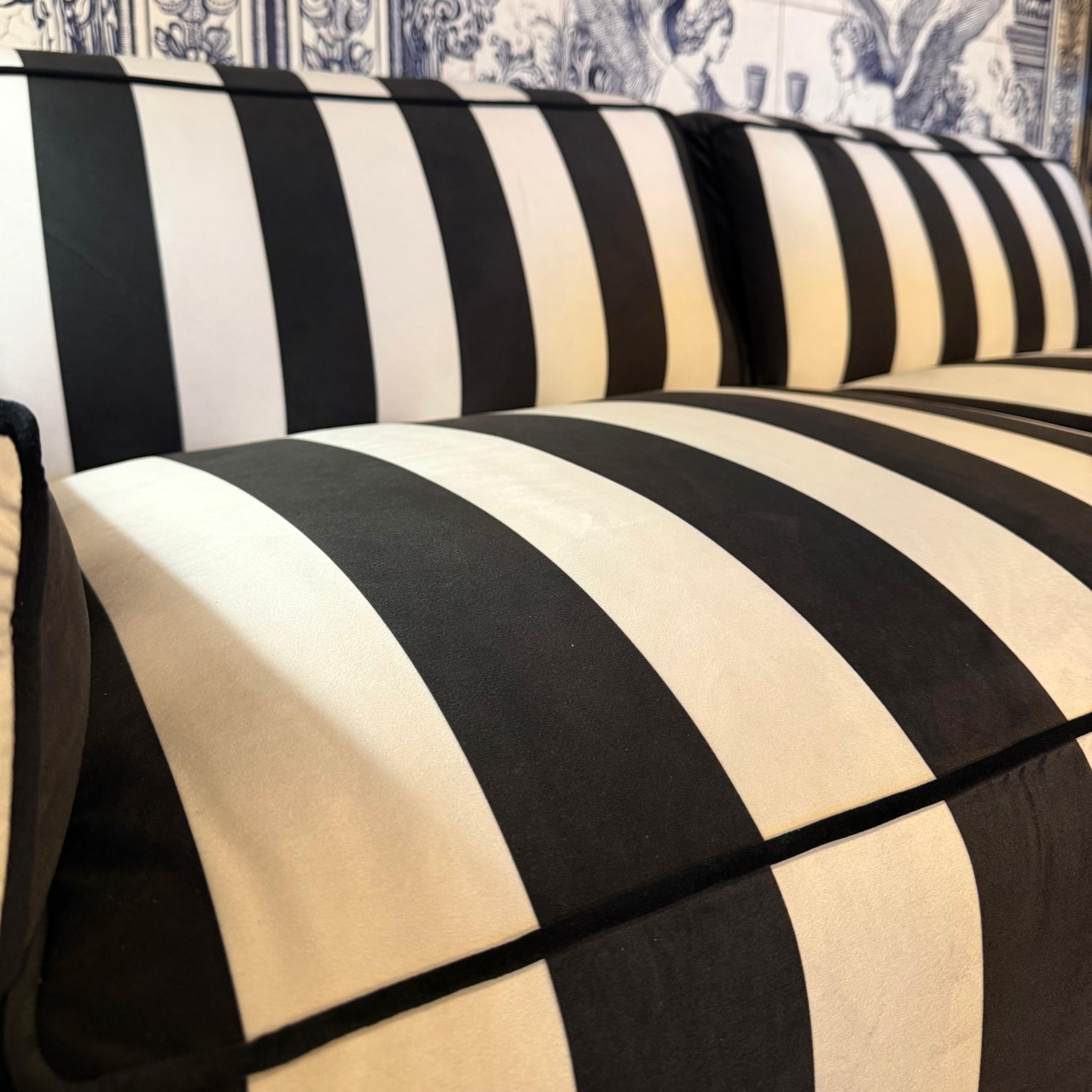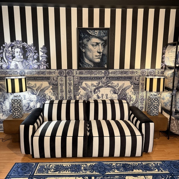 Inspirată de interioarele italiene moderne, Canapeaua Cavo Raya îmbină minimalismul cu eleganța clasică. Dungi verticale alb-negru creează un joc vizual îndrăzneț, potrivit pentru livinguri moderne, spații comerciale rafinate sau studiouri de design interior.
