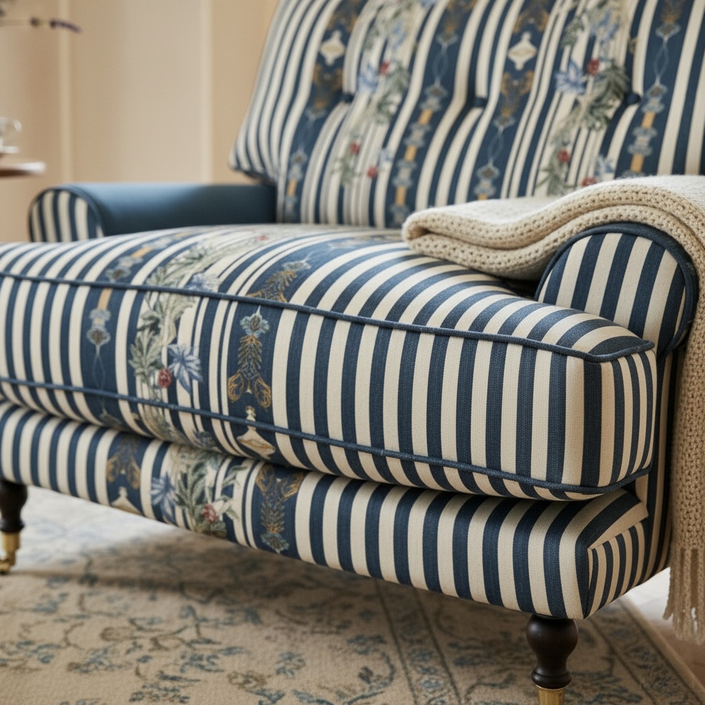 Datorită eleganței sale clasice și simbolisticii profunde, fotoliul Bona Triticum se simte acasă în amenajări care celebrează tradiția și confortul. Perfect pentru living-uri clasice și tradiționale unde dungile navy aduc structură și eleganță, biblioteci personale cu atmosferă liniștitoare și caldă, dormitoare principale unde poți crea un colț de lectură reconfortant, sau spații cu influențe country-chic și rustic elegant unde spicele de grâu își găsesc sensul natural.
