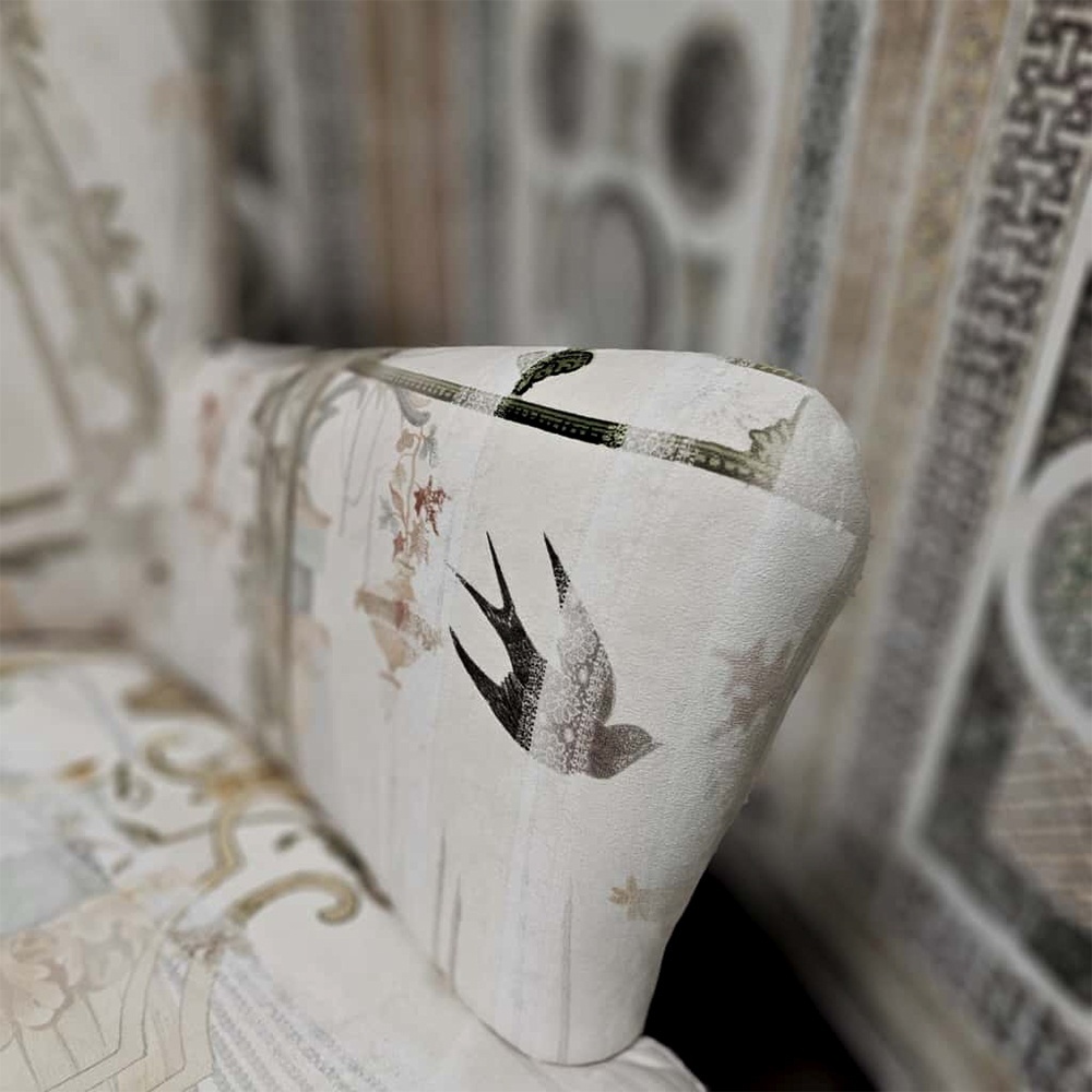 Designul său este definit de o siluetă generoasă și primitoare, cu forme fluide și proporții echilibrate. Tapițeria în nuanțe de celadon poartă imprimeul artistic semnat VLAdiLA – un dans între motive decorative inspirate din artă murală, arhitectură clasică și natură poetică. Textura fină a catifelei adaugă profunzime vizuală și o senzație plăcută la atingere, oferind o experiență tactilă unică.