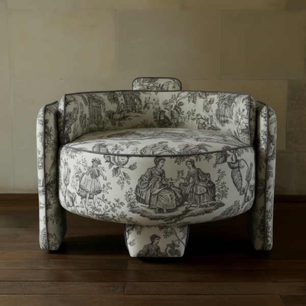 Material premium: Catifea pretioasa, extrem de fina la atingere, imbratiseaza intreaga suprafata a fotoliului. Designul toile de jouy sofisticat in nuante de gri antracit pe fond ivoire prezinta scene pastorale romantice cu personaje in costume din secolul al XVIII-lea, incadrate de ornamente florale detaliate. Fiecare detaliu este gandit cu atentie, de la vipusca contrastanta la spatarul cu element decorativ superior.