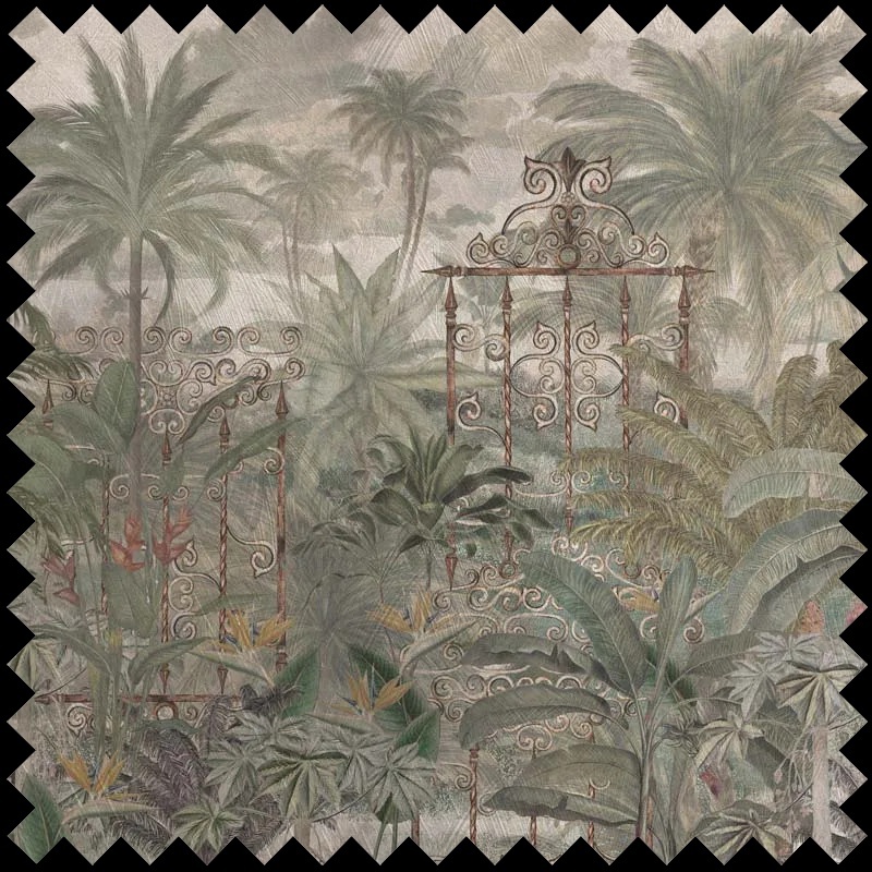 Descoperă rafinamentul și misterul naturii tropicale cu materialul textil decorativ Isla Jade. Acest design impresionant transpune energia luxuriantă a insulelor într-un pattern sofisticat, unde frunzele de palmier și vegetația bogată se întrepătrund cu motive grafice inspirate de porți elegante, simbol al echilibrului și al rezilienței. Tonurile de verde jad, accentele subtile de gri și nuanțele naturale creează o atmosferă liniștitoare, dar plină de personalitate, ideală pentru a aduce un strop de evadare și contemplare în orice decor.