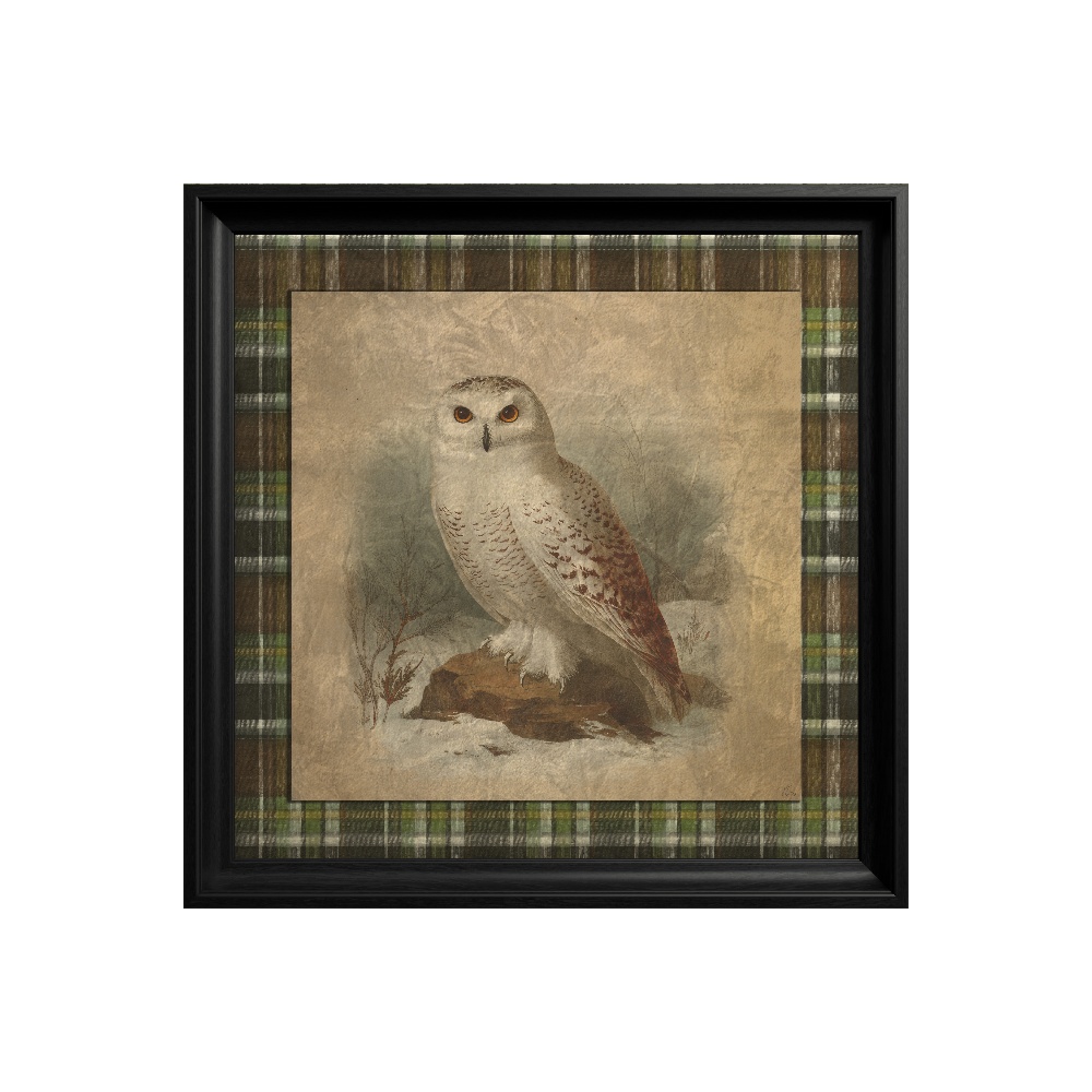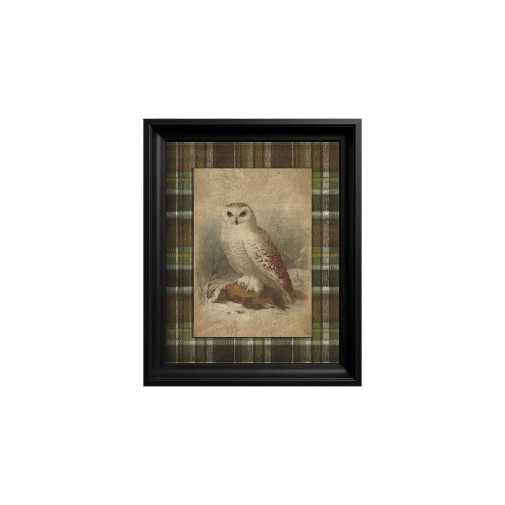 Contrastul cu chenarul închis la culoare, cu model tartan scoțian, evidențiază albul imaculat al bufniței, creând un efect vizual dramatic. Înrămat elegant în negru, acest tablou din colecția "Heritage Menagerie" este o piesă de decor magică, perfectă pentru a inspira înțelepciune, claritate și frumusețe în orice spațiu interior.