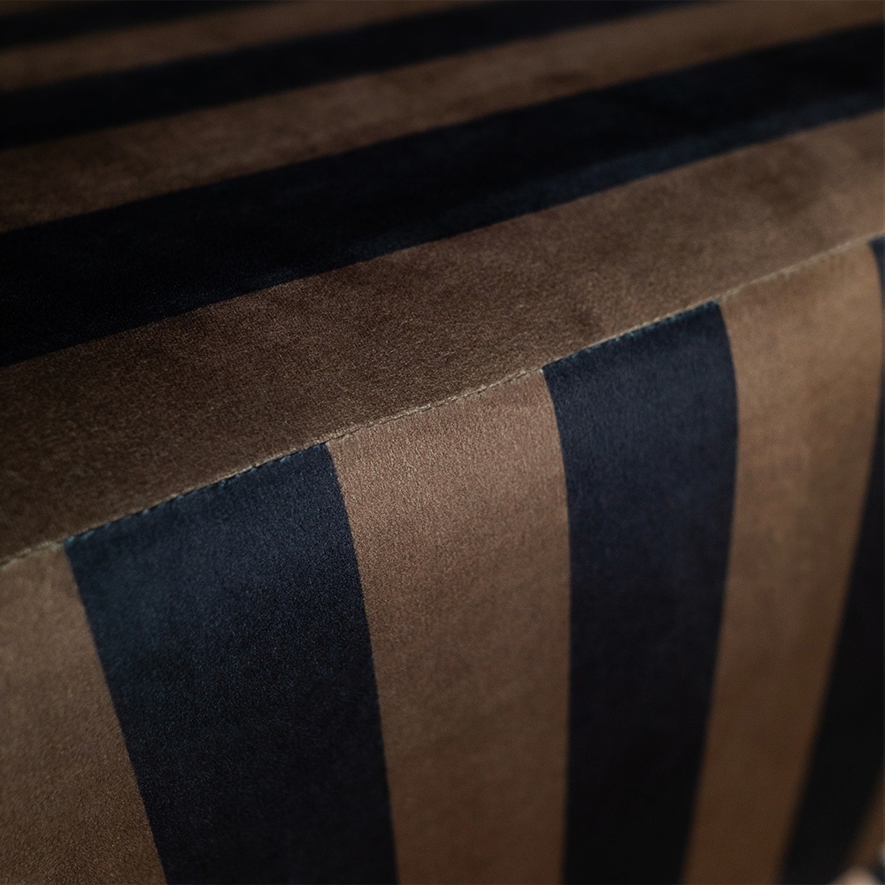 Îmbrăcat în dungi verticale de un negru adânc și maro mineral, MONOLIT devine o prezență sculpturală care aduce gravitas oricărui spațiu. Ritmul grafic al țesăturii evocă un dialog între lumină și umbră, între modernism și mister, între funcționalitate și artă decorativă.