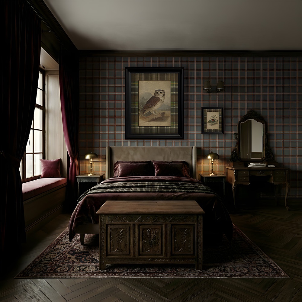 - Dormitor sanctuar: Așa cum ilustrează imaginile de ambianță, tapetul "Linlithgow" creează o atmosferă intimă și odihnitoare în dormitor. Se asortează superb cu mobilierul din lemn închis la culoare și catifeaua în nuanțe de burgundy sau ciocolatiu, oferind un decor "moody" și romantic, perfect pentru nopțile lungi de iarnă.